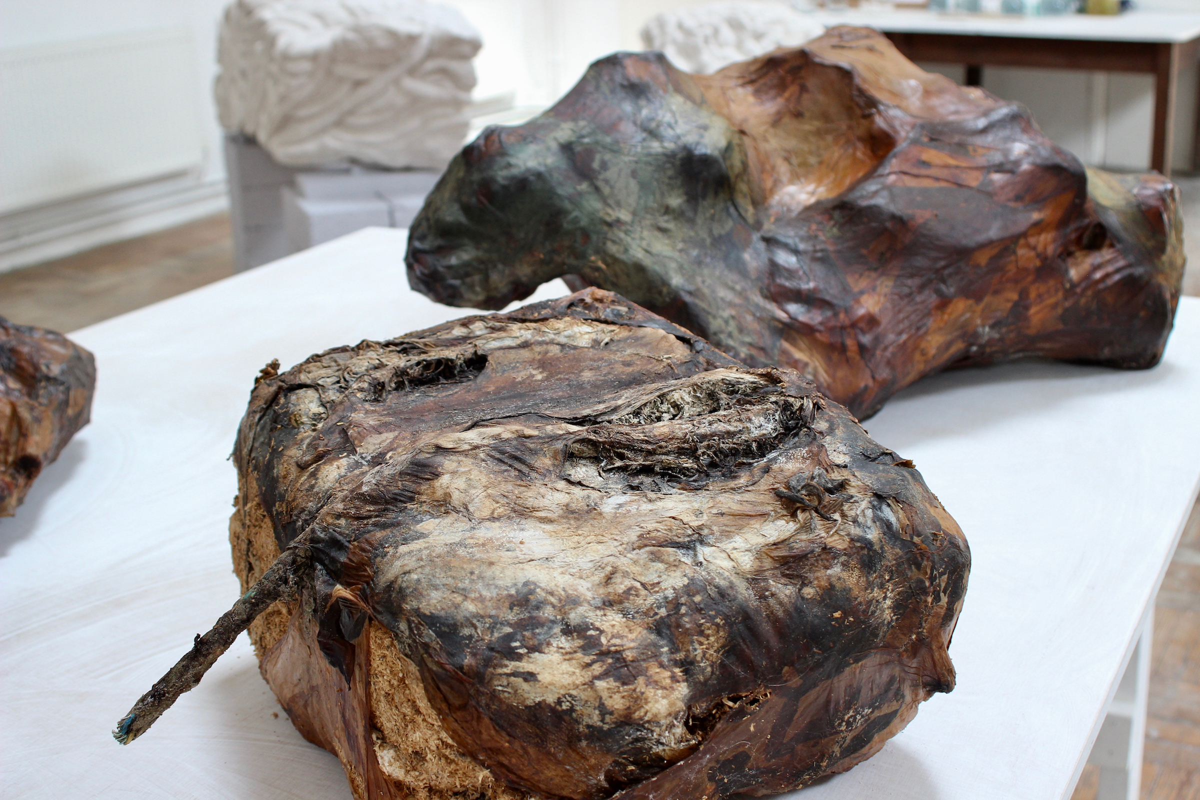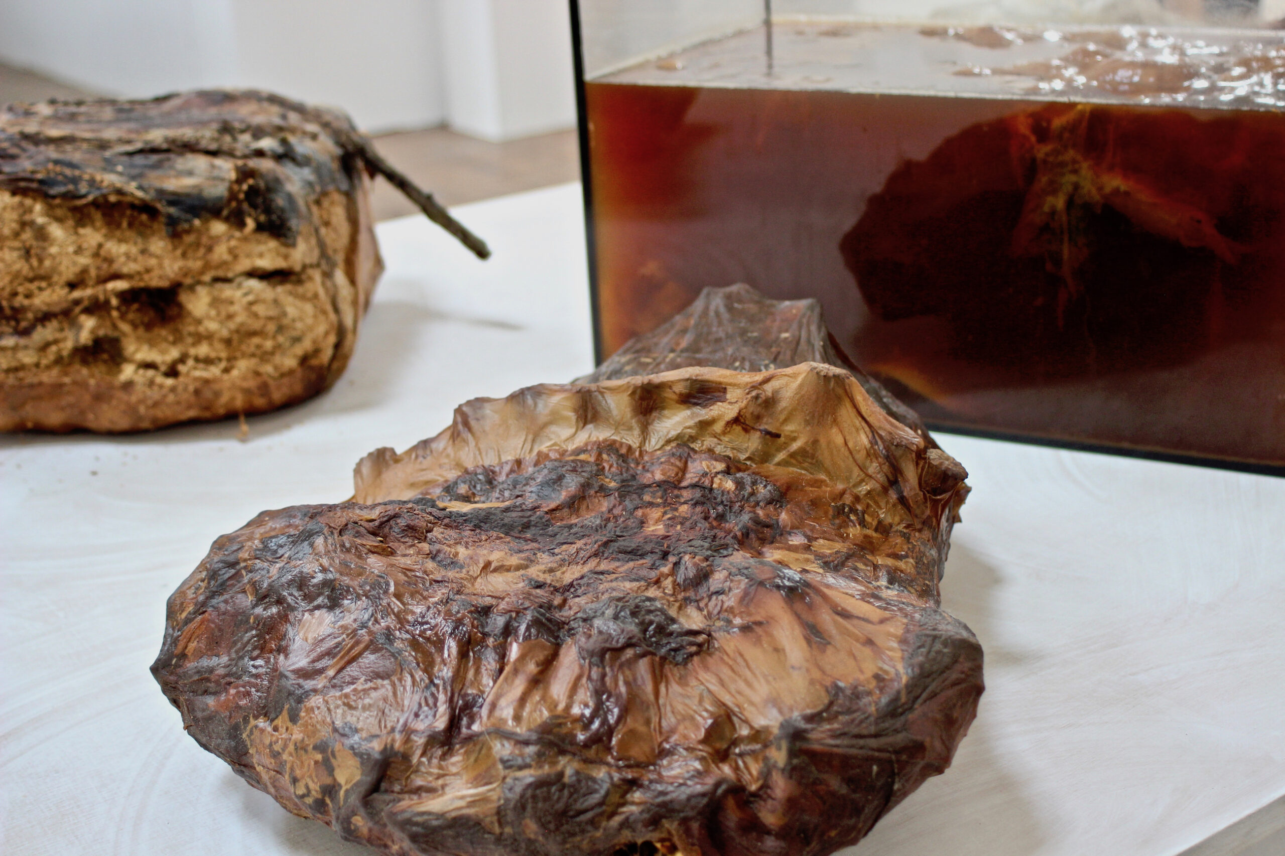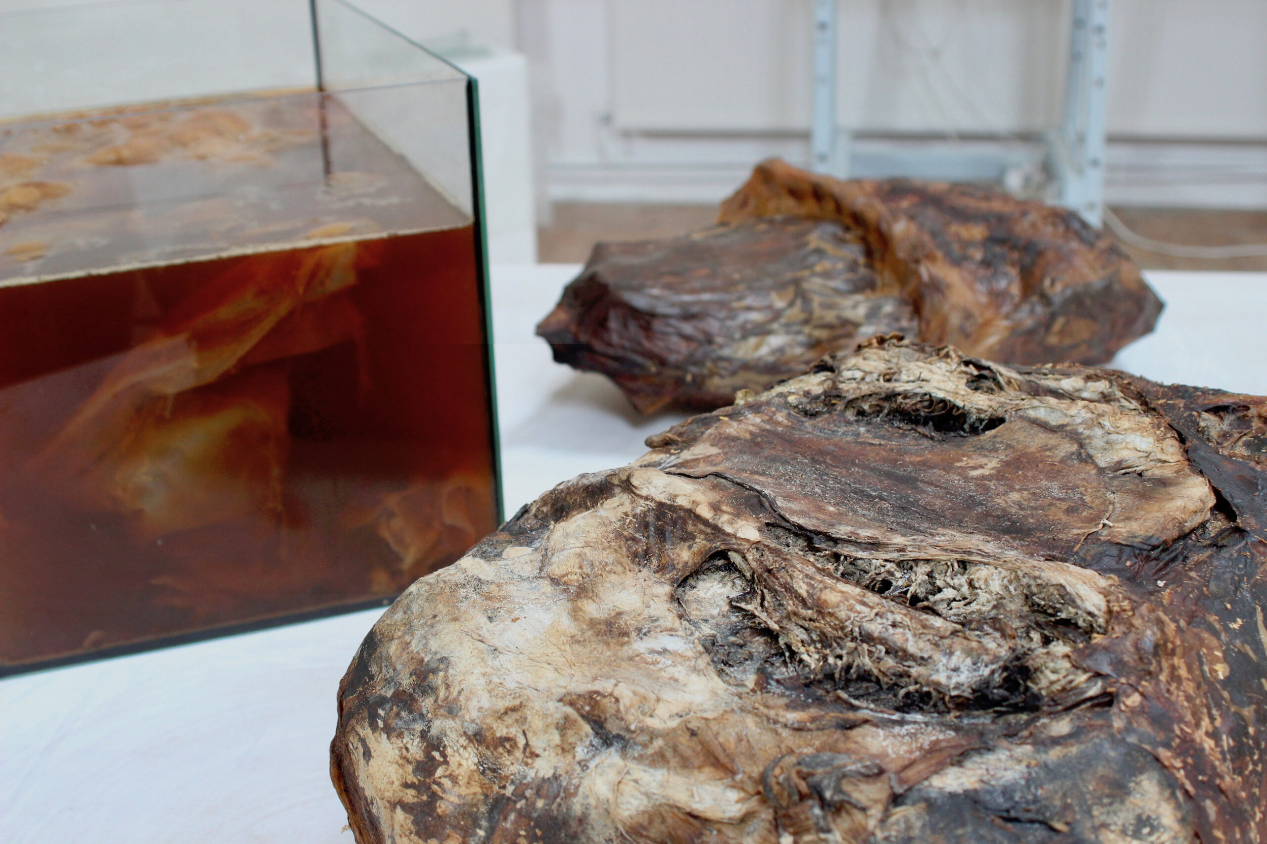 Here are sculptures made with probiotic microbial cellulose, kelp and mycelium inoculated straw.